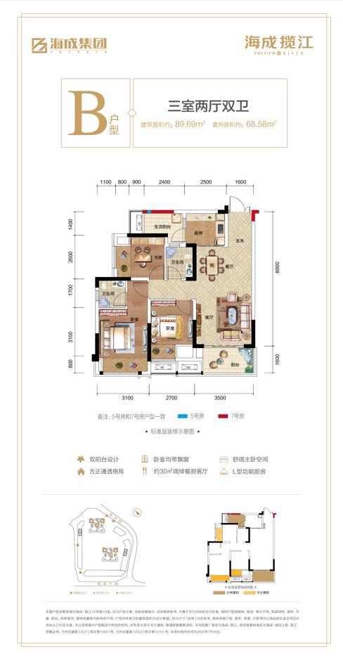 B 3室-2厅-2卫·89.69M²